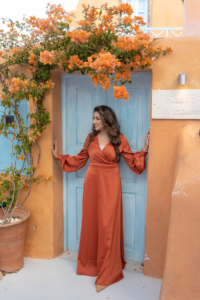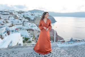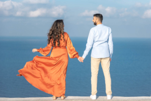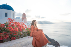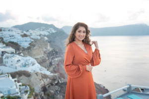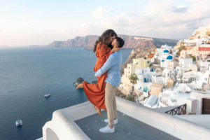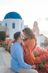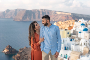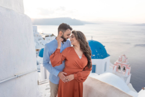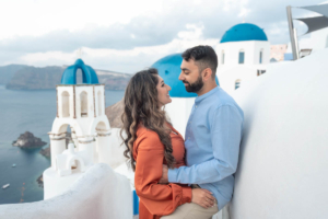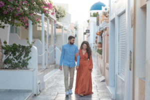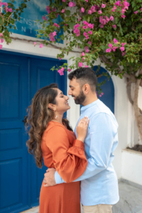 Sumaira and Salman’s sunrise photo shoot in Oia, Santorini was nothing short of magical. Despite the soft gray clouds that blanketed the November sky, the quiet charm of the village and the gentle morning light gave everything a dreamlike glow. The narrow cobbled paths, whitewashed buildings, and iconic blue domes framed their tender moments perfectly. With the Aegean Sea shimmering faintly in the distance, the couple shared quiet laughter and stolen kisses, turning a cloudy morning into a beautifully romantic memory.